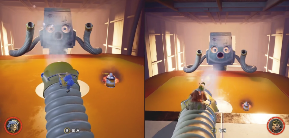游戏采用左右分屏视角,双方角色独立操控但行动高度关联。角色死亡后即时复活,全地图布设密集存档点,降低挫败感;真正影响通关效率的核心,在于操作节奏、指令预判与资源分配的默契度。例如“工具箱”章节中,一名玩家需使用充气锤精准敲击支点制造弹跳平台,另一名玩家须在毫秒级窗口内完成起跳;在松鼠与蜂蜜Boss战中,必须同步运用树脂枪黏附+火焰枪引燃,方能触发持续燃烧伤害。此外,各章节均藏有非强制但具叙事补完意义的互动彩蛋:俄罗斯方块房间需高频扫描墙面获取线索,雪景球场景中与乌龟的多次互动可解锁专属成就,鼓励玩家放慢节奏、主动探索。