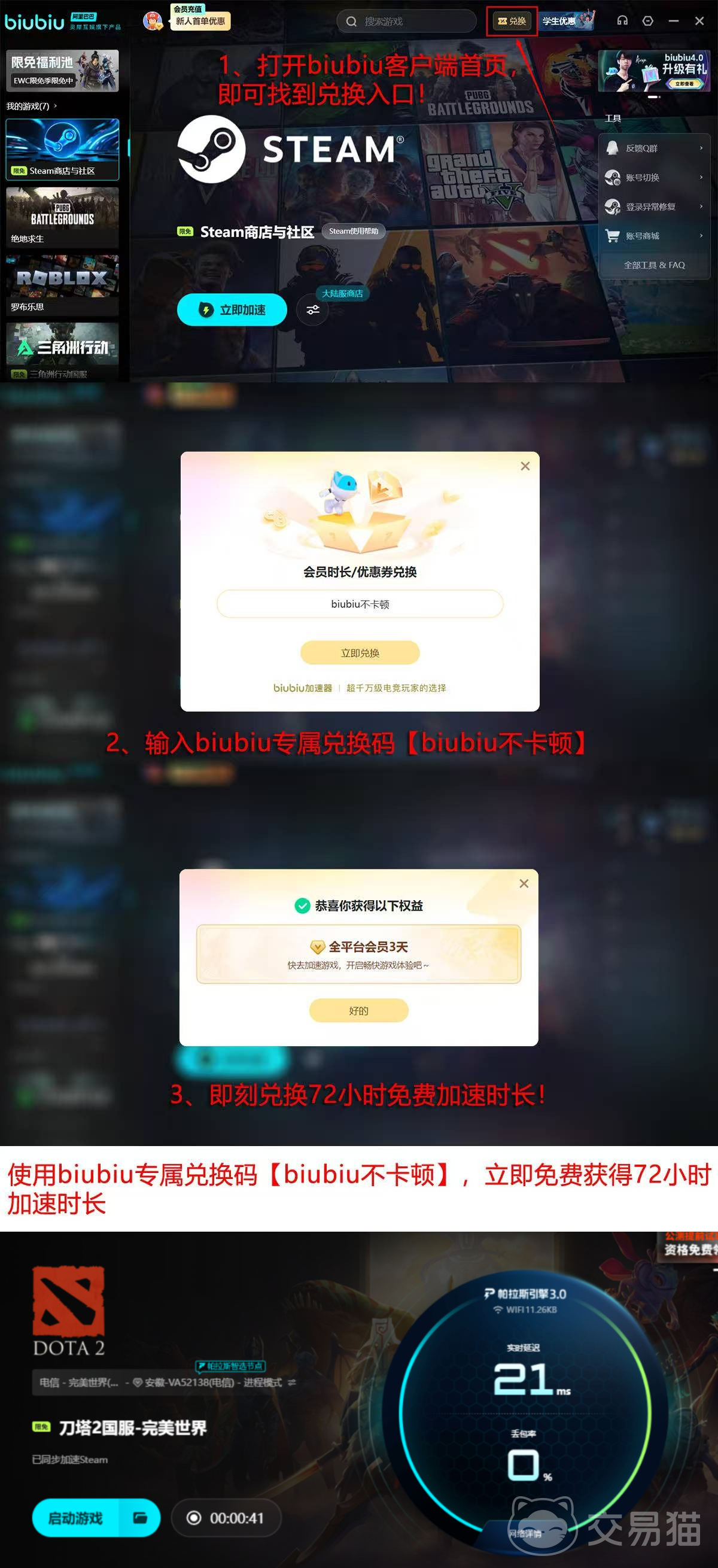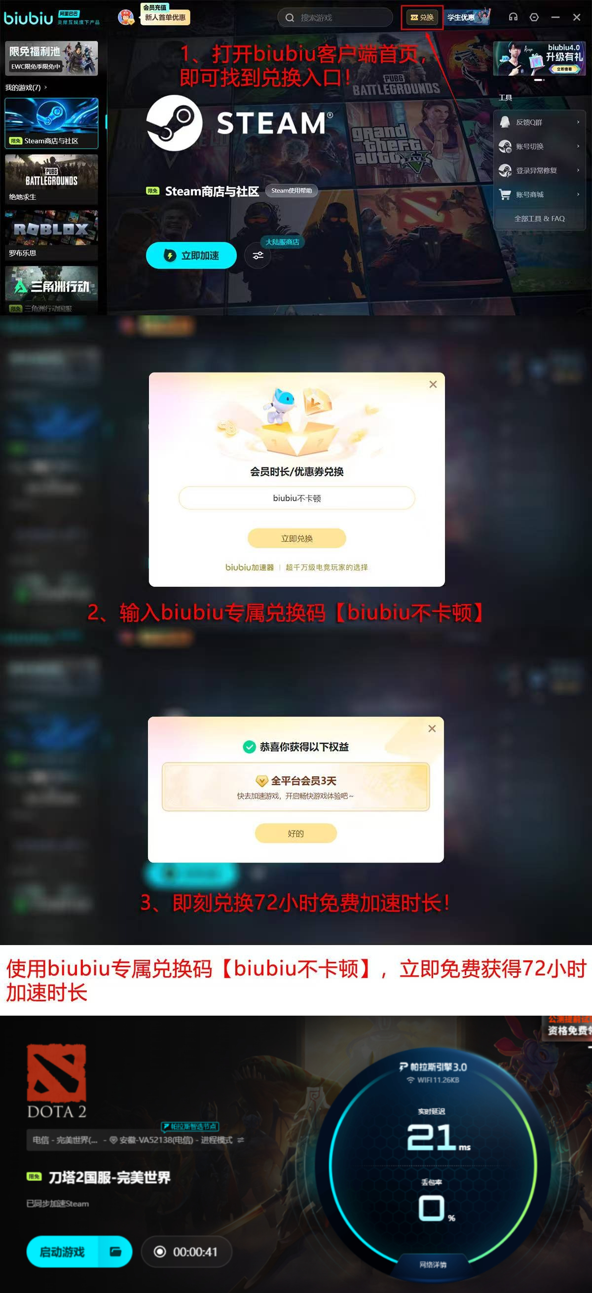 biubiu加速器现开启新人激励计划:新注册用户可即刻领取全平台通用加速服务24小时;使用兑换码【biubiu不卡顿】还可额外激活72小时加速权益,总计享96小时免费加速时长,充分满足7.40版本全流程体验需求。
