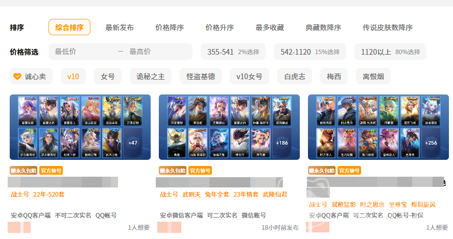 王者荣耀卖号估价表虽然没有最新的,但是根据游戏性质的不同,建议大家可以直接选择一款靠谱的游戏交易平台,在这里实时观察当前该应用的账号价值情况,还能根据自己账号内所有的皮肤进行检索,找到和自己类似的账号,观摩其他人的定价,大家心里就有数了