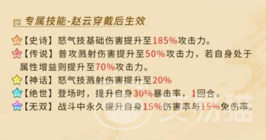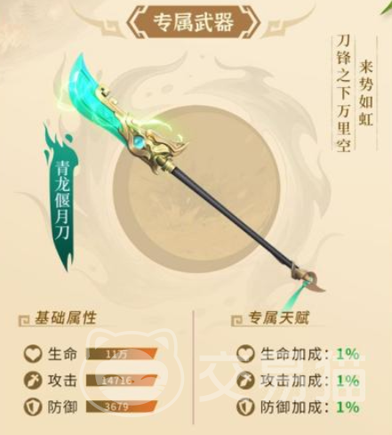 以关羽专属神兵“青龙偃月刀”为例,其初始即提供生命、攻击、防御三项属性各1%的固定加成。进入传说阶段后,首次激活核心技能效果:普攻溅射伤害提升50%攻击力;若关羽处于任意增益状态(如暴击率提升、攻速加快等),额外再获得70%攻击力加成。该效果与后续神话、绝世阶段的技能强化并行生效,形成复合型输出跃升。
