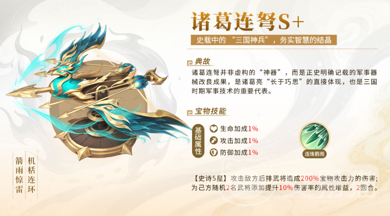 首推S+品质宝物【诸葛连弩】。该装备还原诸葛亮改良连发弩的历史设定,定位为战术型专属配装,优先适配诸葛亮角色。装配后,可同步提升三项基础属性各1%,并激活核心技能“连珠箭雨”:对敌方后排全体目标发动一次范围攻击,造成等同于宝物自身基础攻击力200%的伤害。需注意,该伤害数值不依赖武将武力值,而由宝物当前等级所决定的基础攻击力为计算基准;等级越高,实际输出越强。此外,该宝物附带随机增益效果——每回合有概率为我方一名武将附加10%全队伤害提升,持续两回合。若连续触发至主力输出位,团队爆发能力将明显跃升。