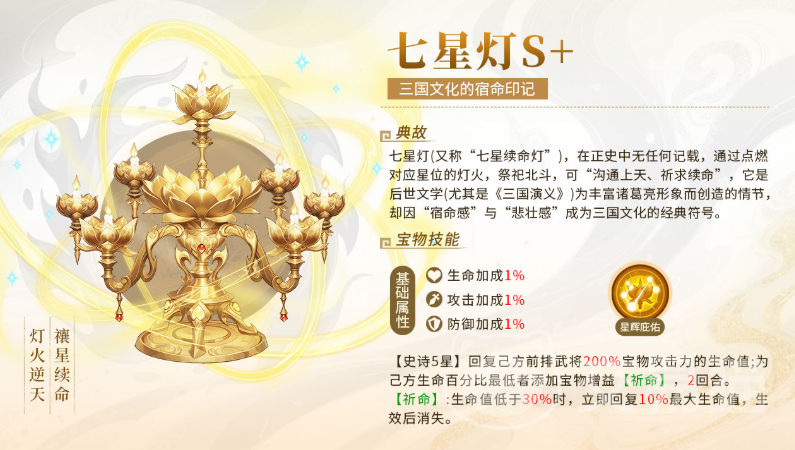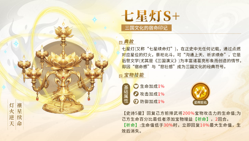 第三款推荐S+品质宝物【七星灯】。其基础属性加成为三项各1%,侧重生存向功能设计。核心技能“新规必有”专为前排肉盾优化:当佩戴者生命值低于30%时,立即恢复其10%最大生命值;同时,该技能还可为当前我方生命比例最低的一名友军施加“请命”效果,在关键节点提供二次容错空间。整体效果兼顾即时回血与战略保核,是阵容坦度构建与持久作战的重要支撑。