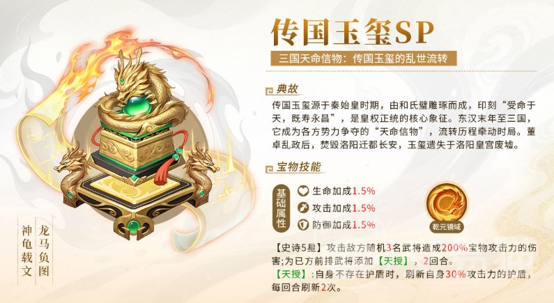 次推SP品质宝物【传国玉玺】。其基础属性加成为三项各1.5%,高于普通S+宝物。激活专属技能“乾元镜域”后,可随机选取三名敌方单位,施加等同于宝物基础攻击力200%的单段伤害。因品质更高,其基础攻击力数值天然优于诸葛连弩,故实际伤害量级更优。同时,该宝物具备前排防御强化机制:每回合可为我方前排武将生成护盾,护盾值按当前前排角色最大生命值百分比计算,且每回合刷新两次,大幅提升前排承伤稳定性与续航能力。