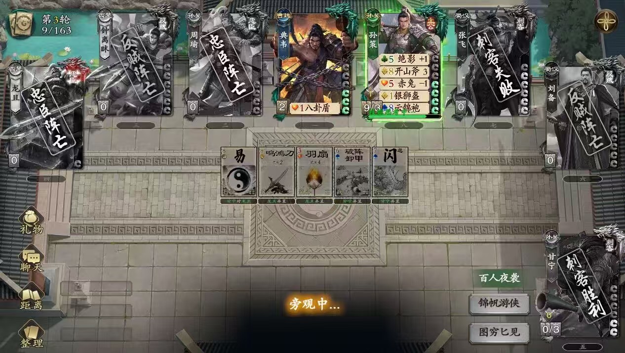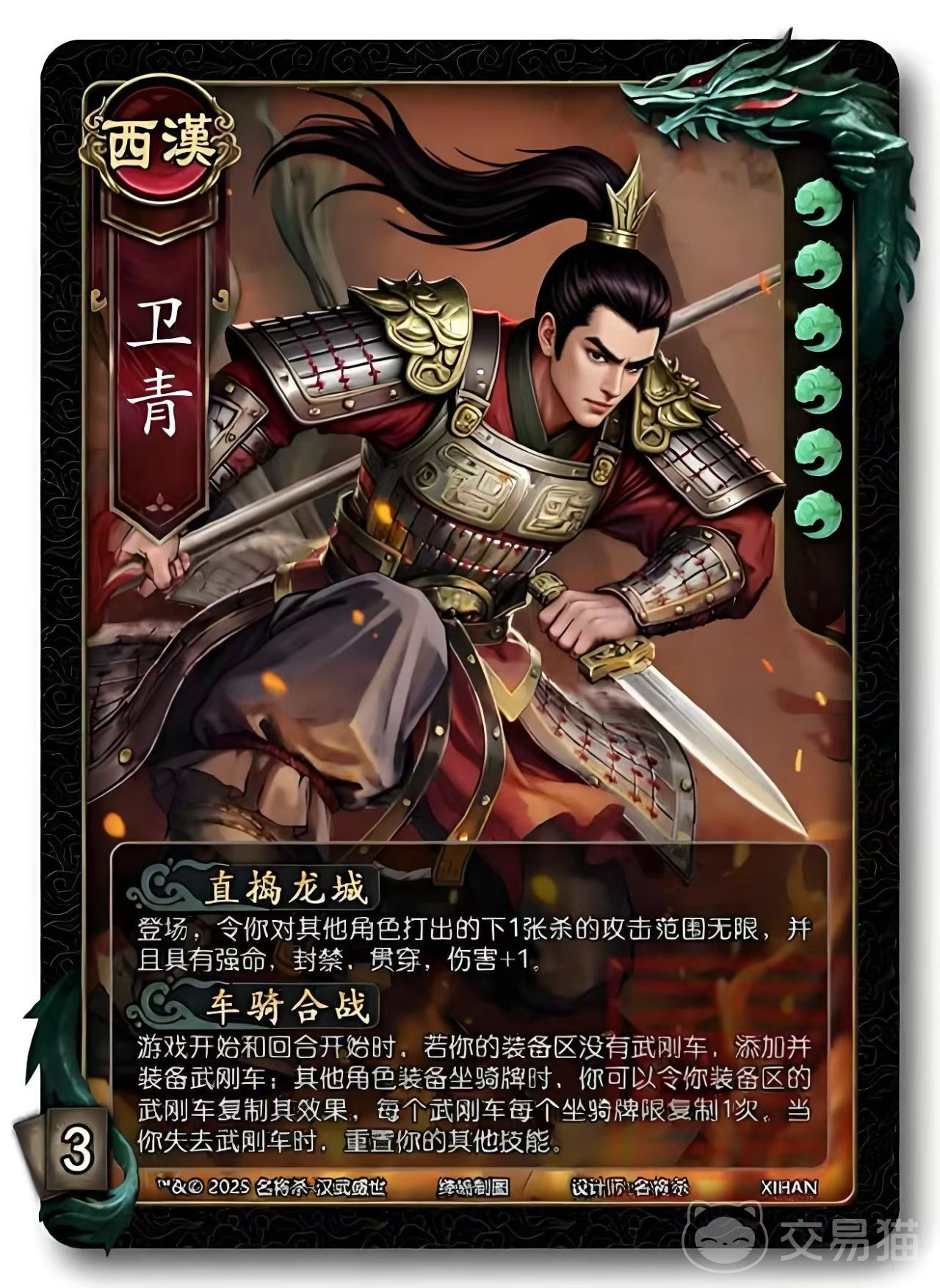第二技能【车骑合战】具有自动装配与动态复用双重机制:游戏开始及每回合开始阶段,若卫青装备区无【武刚车】,则立即生成并装备一张【武刚车】;当其他角色装备任意坐骑牌时,卫青可选择以自身【武刚车】复制该坐骑的一项效果(如【千里马】的+1马、【绝影】的-1马等);每个【武刚车】对同一坐骑效果仅可复制一次。特别的是,一旦【武刚车】被弃置或失去,卫青将重置【直捣龙城】技能冷却,使其可再次发动,从而实现关键回合内的二次爆发循环。