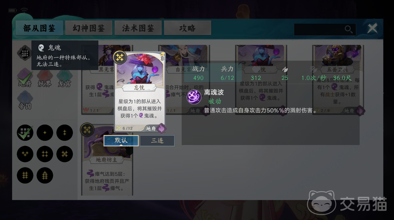 六大势力中,幽都以“鬼魂”与“瘴气”双机制驱动,专注中后期质变。其部从普遍具备召唤与持续强化能力,例如黑无常可施放魂咒,瞬时生成多具傀儡,实现兵力压制;瘴气则为高成长性部从提供属性跃升通道,需搭配潜力值突出的单位才能最大化收益。