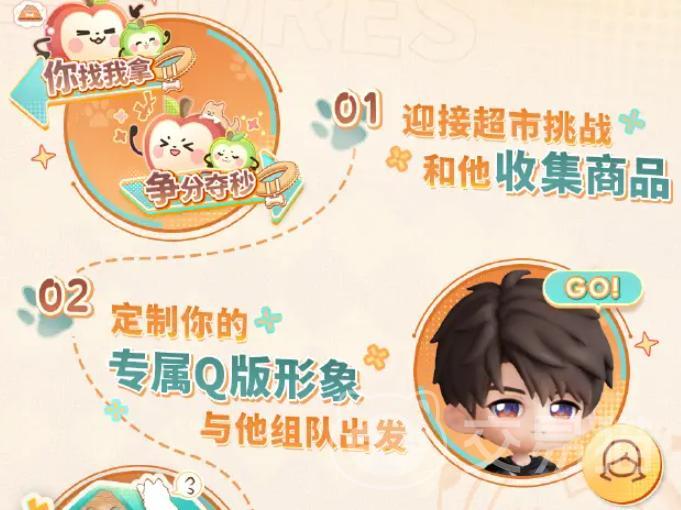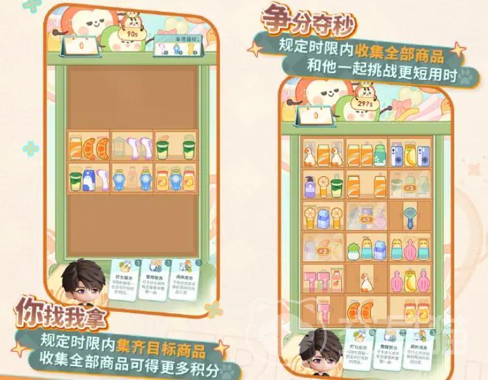 活动流程分为四个核心环节:首先进入超市场景,协助夏以昼完成货架整理;随后进入“商品收集挑战”关卡,在限定时间内识别并归类目标物品;第三步为Q版形象定制,玩家可自主设定外观,并与夏以昼组成固定搭档;最后进入主线剧情模块,共同参与以宠物救助为主题的公益向赛事任务,推动故事发展。