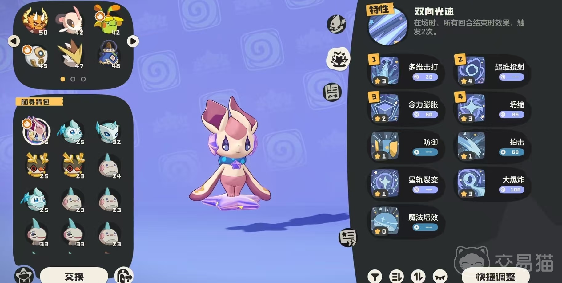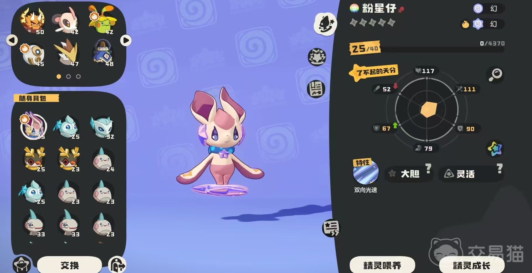 粉星仔拥有粉紫主色调、长耳造型与星形装饰,视觉辨识度高,尤其受偏好萌系风格的玩家青睐。其进化链为:粉星仔 → 粉耳星兔 → 流星粉耳兔,全阶段共可解锁400点图鉴经验,包含3次基础形态图鉴进度及1次“了不起天分”特殊成就。尽管战力未达当前版本T0梯队,但在图鉴补全、队伍功能搭配与特定副本辅助场景中具备不可替代性。
