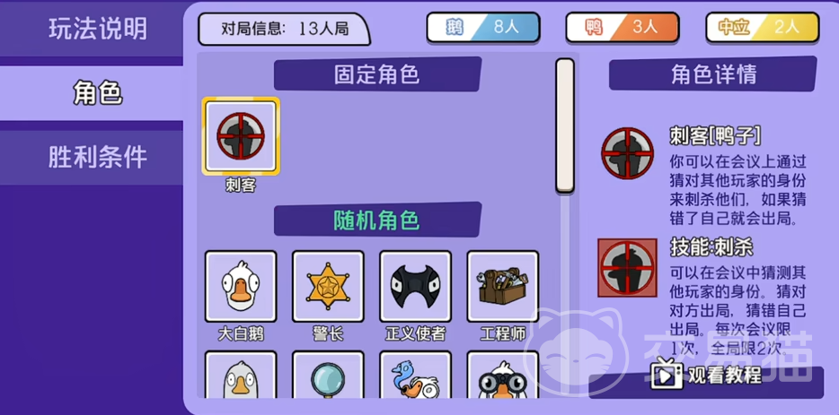 鸭子阵营为对抗方,目标具有双重性:一方面可通过主动触发系统级破坏事件延缓任务进度,另一方面亦可利用隐蔽行动击杀鹅阵营玩家。中立阵营则呈现高度差异化特征,每位角色均配备专属胜利条件,仅当独立完成对应特殊目标后方可判定获胜,其行为逻辑与胜负判定完全独立于其他两方。