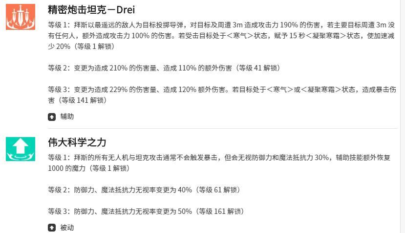 “精密炮击坦克”技能赋予拜斯中距离精准打击能力,投掷式导弹在3米范围内触发高额伤害增幅;当技能升至2级时,额外提供100%基础伤害加成,显著提升区域清场效率。“伟大科学之力”则体现其辅助价值——释放后可同步提升自身防御力与魔法抗性,属于少有的攻防一体型被动强化技。