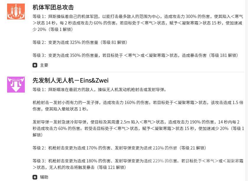 拜斯的基础定位为战术指挥型游侠,拥有鲜明的机械科技风格战斗逻辑。其首项主动技能“机体军团总攻击”可召唤编队作战单元发动范围打击,单次命中造成300%攻击力伤害,并使目标陷入寒气状态——该状态持续期间,目标移动速度降低20%;该技能随等级提升可强化基础伤害数值。另一关键技能“先发制人无人机”则通过部署空中载具发射制导导弹,兼具物理伤害与寒气附加效果,形成双重减速压制,有效限制敌方机动节奏。