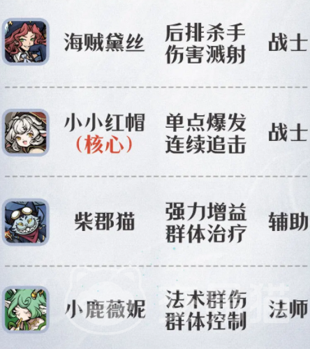 “小小红帽”作为核心战士,专注单体爆发输出,附带连续追击与高倍率技能释放特性,适用于快速瓦解敌方高威胁单位;“柴郡猫”则定位为群体治疗型辅助,通过稳定续航保障全队生存下限。四大职业类型——法师、守卫、战士、治疗——构成基础队伍框架,确保输出、承伤、复活、恢复等维度能力均衡覆盖。