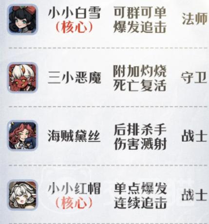 职业体系是战力构筑的底层逻辑。不同职业在技能形态、作用范围与战场定位上存在本质差异:例如“小小白雪”归属法师职业,具备群体AOE清场与单体点杀双重能力,可灵活应对多目标压制或关键目标斩杀场景;而“三小恶魔”则承担守卫职能,拥有队友复活机制与持续灼烧伤害叠加效果,在持久战中提供战术容错与压制节奏。