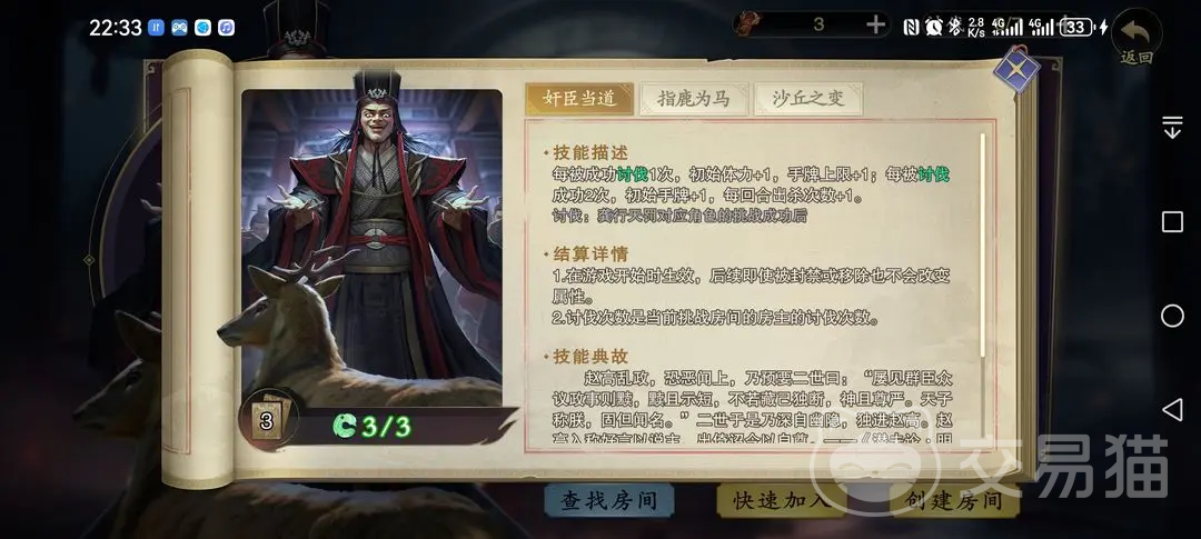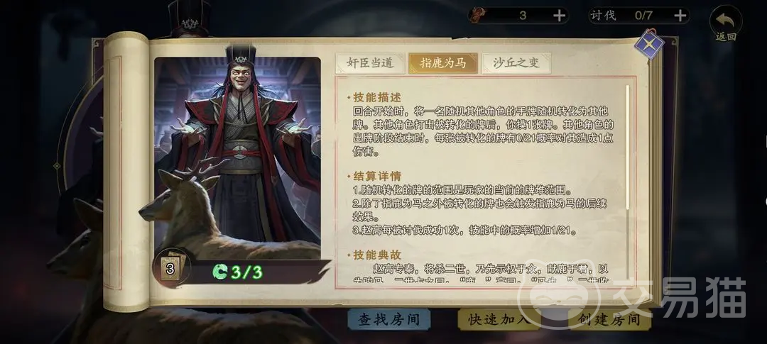 赵高的一技能【奸臣当道】构成核心成长逻辑,直接影响战斗节奏。二技能【指鹿为马】具备强干扰性:回合开始时,可随机将一名角色的手牌转化为其他类型牌;若被转化牌被打出,则赵高额外摸牌。应对要点在于主动弃牌规避转化触发,或选用手牌可控性强、响应能力突出的武将,如小乔(反向判定)、张良(限制出牌)、吕布(高爆发压制)等,有效压缩其摸牌空间。