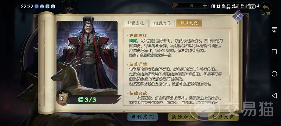 三技能【沙丘之变】为高风险连锁技:当任意角色阵亡时,赵高立即获得其全部手牌与装备,并在当前回合内免疫所有响应类效果(包括闪、桃、无懈可击等)。因此,团队生存能力成为胜负关键——务必优先配置续航型武将,控制伤害分配节奏,避免减员引发的强度跃迁。