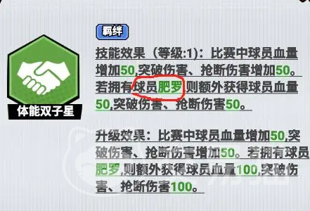 当球员达到金色品质后,即可投入红色巨星的定向培养。此时需注意资源倾斜策略——已成型的金色球员应尽快用于升星消耗,避免闲置造成战力断层。除基础属性成长外,球员在解锁第三技能后将激活“上阵联动效果”,即通过特定组合触发额外加成。例如,小罗在单独上场时可激活【体能双子星】技能,为全队提升50点生命值及50点突破伤害;若与肥罗共同出战,则进一步叠加50点抢断能力,实现1+1>2的战术协同价值。