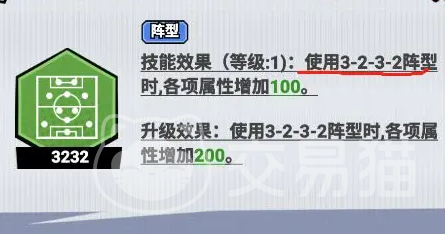 此外,第五技能位专用于部署【阵型效果】,该类技能仅在启用指定阵型时生效。以3232阵型为例,启用后可使全体球员获得100点属性加成。该机制要求玩家在规划阵容时同步考虑阵型适配性,而非仅关注单体强度。若前锋位置尚未配置红色球星卡,可先以明星球员作为过渡核心,其稳定的基础战力足以支撑前期推图与竞技需求。