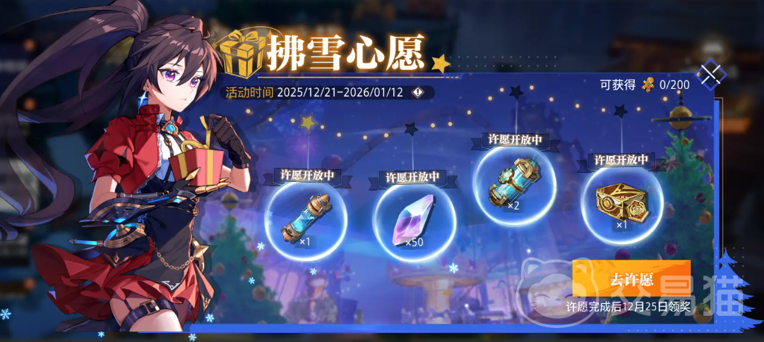雪季心愿玩法将于12月21日至24日期间开放。玩家可在银淞树场景中提交许愿申请,自12月25日起按日分批发放回馈奖励,包含徽记模块自选盒、圣物之芯及晶珀等关键道具。
