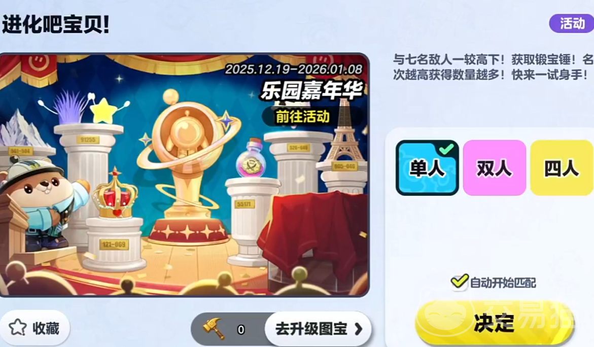 获得图宝后,可通过“进化吧宝贝”系统进行品质提升。锻宝锤是关键道具,可通过三种方式稳定获取:完成嘉年华指定任务、在150秒内通关年度地图、或参与“图宝辨真伪”趣味挑战。每次锻造将解锁全新外观样式,涵盖高颜值设计与创意搞怪风格,鼓励玩家达成全图鉴收集目标。