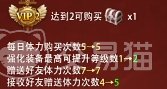 VIP1至VIP2为入门档位,合计需累计充值42元。达标后开放VIP每日礼包与每周礼包领取权限,内容以基础养成材料为主,适合新手阶段快速过渡使用。