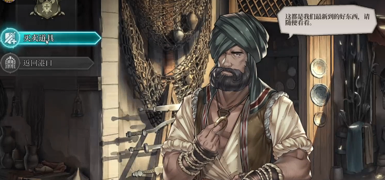 不同港口商店所售装备具有鲜明地域特色与功能倾向。巴塞罗那港提供近战轻装组合:匕首适配敏捷型海员,布甲兼顾基础防御与机动性,礼帽具备视觉辨识与轻微属性加成,沙漏则用于特殊技能冷却调控。