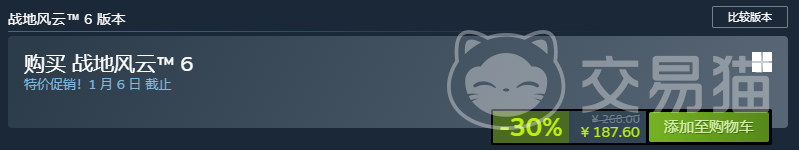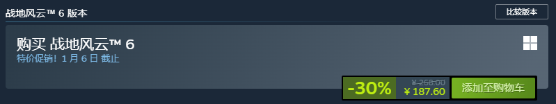 Steam平台2024年冬季特卖期间,《战地6》标准版实售价格为187.6元,较官方原价268元下调30%,创发售以来新低。此前黑五促销价为227元,本次降价进一步扩大了性价比优势,成为当前入手该游戏的关键窗口期。