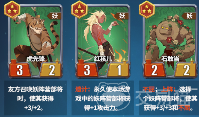 当资源积累至一定阶段,可逐步引入三星角色以强化中期战力。虎先锋适配前期节奏,其技能可使所有妖阵营单位额外获得+2点伤害;红孩儿虽基础成长偏低,但仍能有效补强妖系队伍的整体输出能力;石敢当具备长线使用价值,可在挑战中指定一名友方单位,赋予其+3点不屈属性,显著提升容错率与持久作战能力。