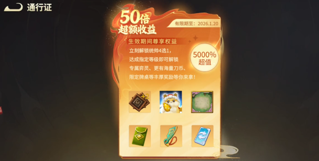 进阶玩家可重点关注68元高级通行证,购买后立即解锁额外统帅栏位,显著增强阵容构筑自由度;同步获得专属棋盘、强力异灵及大量养成资源。值得注意的是,600元档位恰好处于200元返利区间上限,可全额享受200%返利,相当于实际到账资源翻倍,是性价比突出的选择。若需快速推进卡册收集进度或储备长期发展资源,推荐选择166元组合包,内含68元高级通行证、68元至尊月卡与30元超值月卡。月卡体系为日常资源获取主渠道,激活后即赠玉璧,并每日发放刀币,两档月卡合计可获130枚与80枚刀币。