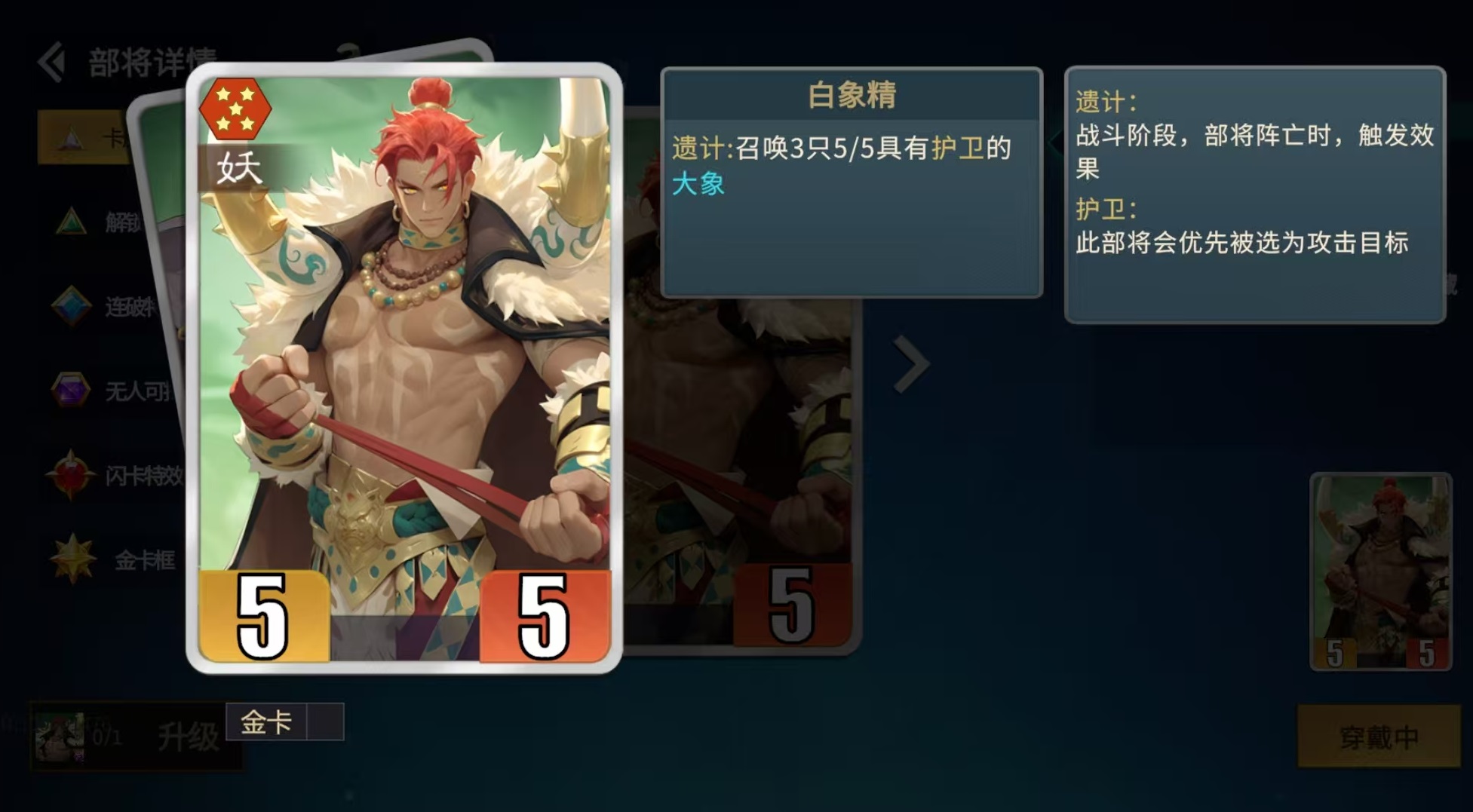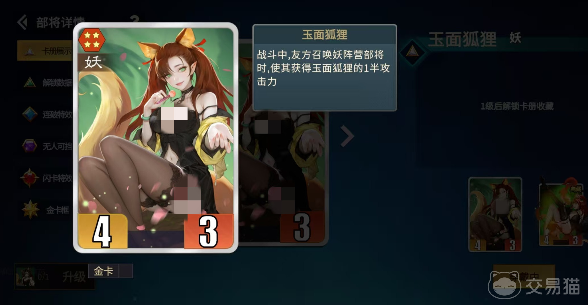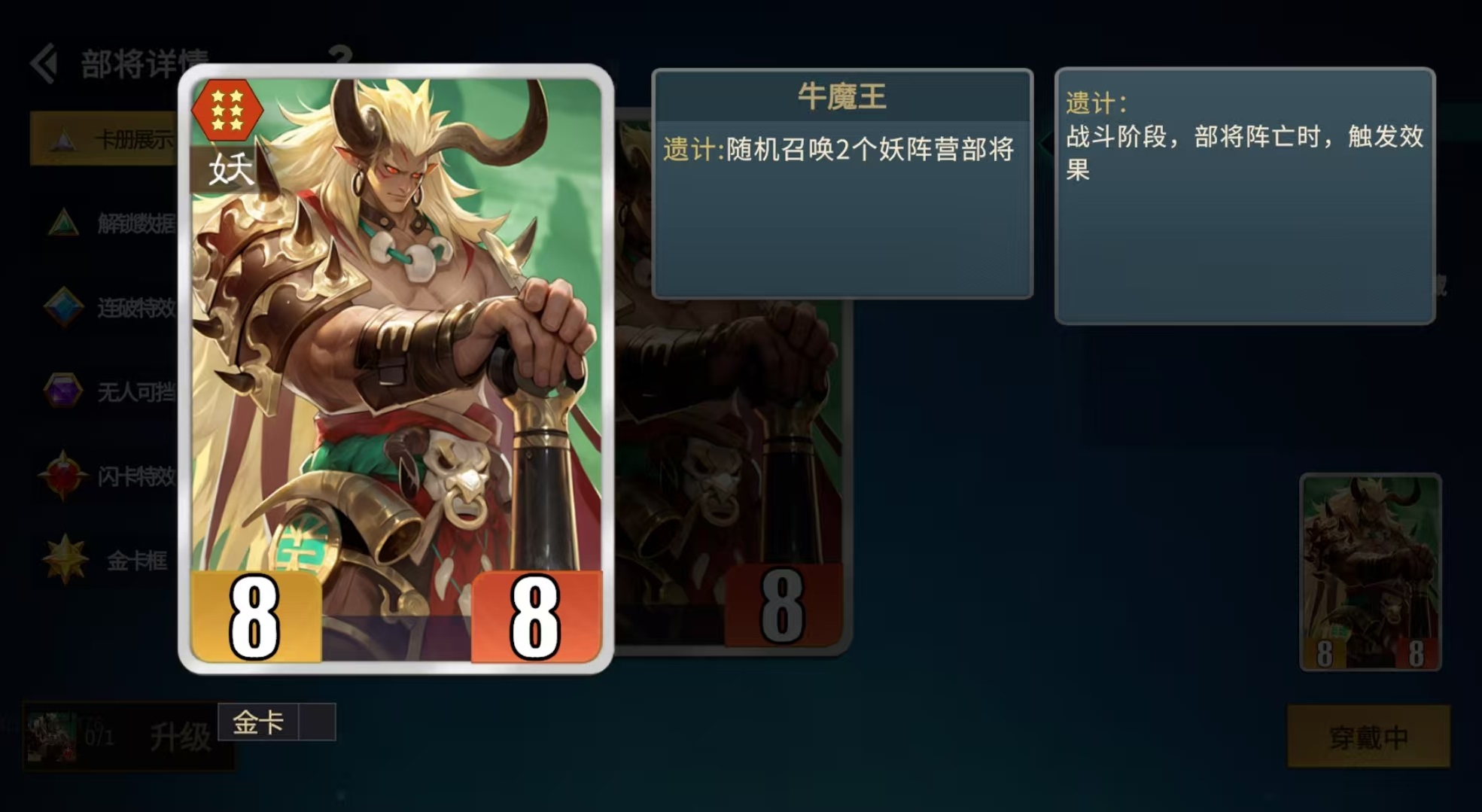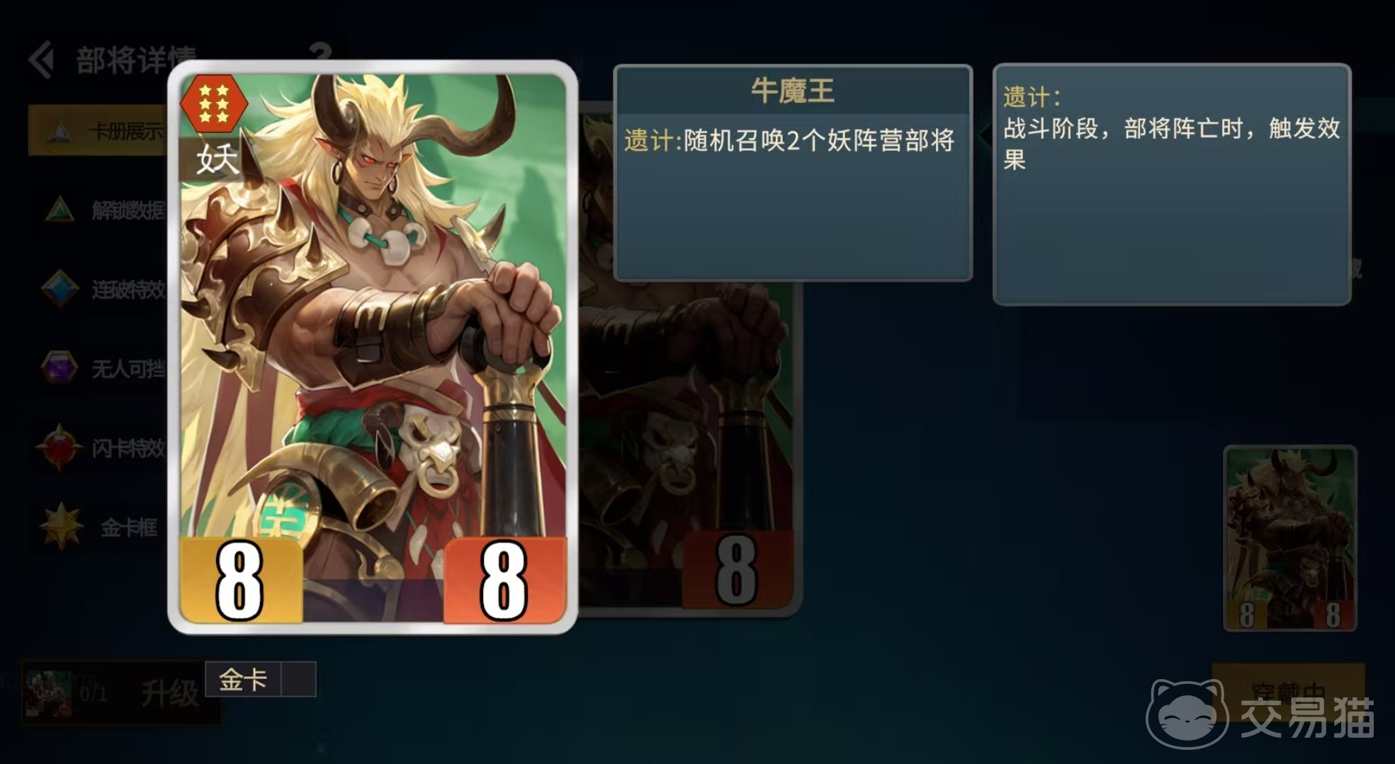 九尾的基础技能为:自身死亡时,依据当前己方手牌中数量最多的阵营,召唤1名该阵营随机部将;升至金卡后,召唤数量提升至2名。该效果绑定“遗计”机制,且九尾自带“护卫”属性,可强制吸引敌方攻击目标,显著提升技能触发稳定性——只要将其部署于前排,几乎必然完成死亡结算并激活召唤。需注意的是,判定依据为触发瞬间手牌内各阵营卡牌总数,不包含已上阵或弃置区域的卡牌。