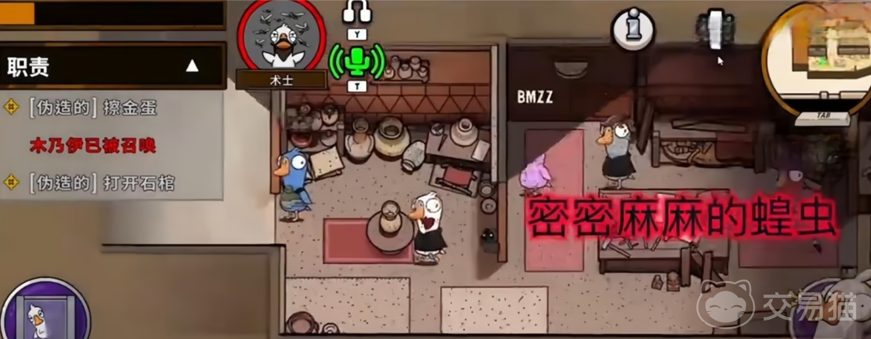 术士并非开局即拥有的身份,而是需在古代沙地地图中,以鸭子身份完成特定狼人任务后方可激活。该角色不具备常规鸭子的破坏技能,唯一主动技能为“召唤蝗虫群”,属于无差别AOE效果,对范围内所有玩家持续造成伤害,15秒内可致死。值得注意的是,该技能生效后不受术士是否存活影响,即使施放者被淘汰,蝗虫群仍会持续蔓延并执行击杀判定。