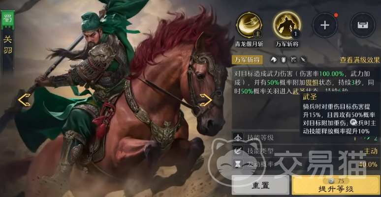关羽作为二号位核心输出,承担主要爆发与状态压制任务。“斩将夺锋”与“夺神箭”构成标准重伤流配置:每层重伤降低目标10%移速,叠满三层后触发虚弱效果,使其攻击力下降70%。该机制配合“长驱直入”提升技能释放频率,确保重伤覆盖率;同时,枪兵兵种加成可激活其“武圣”状态,使技能发动率额外提高10%,大幅增强连招稳定性与伤害转化效率。