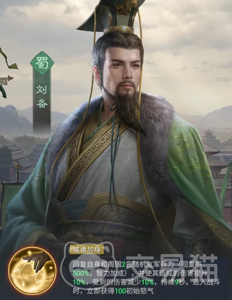主将位推荐由刘备担任,核心价值在于提供全队物理减伤与持续续航保障。其专属战法“天香”可为全体友军降低15%物理伤害,并使自身进入稳定回血状态;搭配辅助型战法“仁治武功”,进一步强化承伤韧性,在受到集火时显著延长站场时间。二者组合不仅大幅提升前排容错率,更有效维持队伍整体行动节奏,避免因主将过早退场导致战术链断裂。