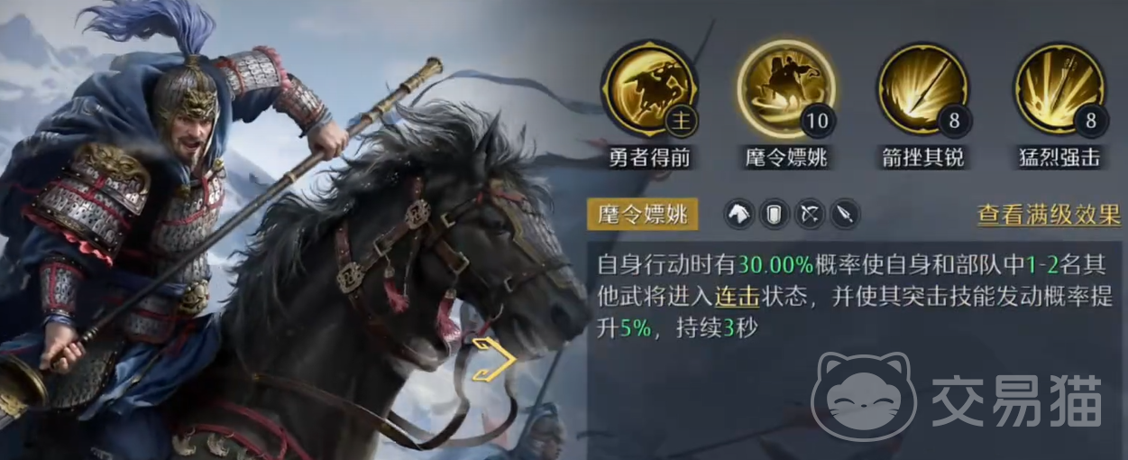 阵容战术支点在于张辽的机制革新:其被动技能现可使相邻1至2名友军获得连击状态,基础触发概率为30%;经首次进阶后提升至35%,后续强化还可再叠加10%概率上限,最终可达45%。需注意的是,该加成仅作用于连击类效果触发,不涉及突击技能的发动几率,具体固有技能叠加逻辑尚待官方进一步说明。