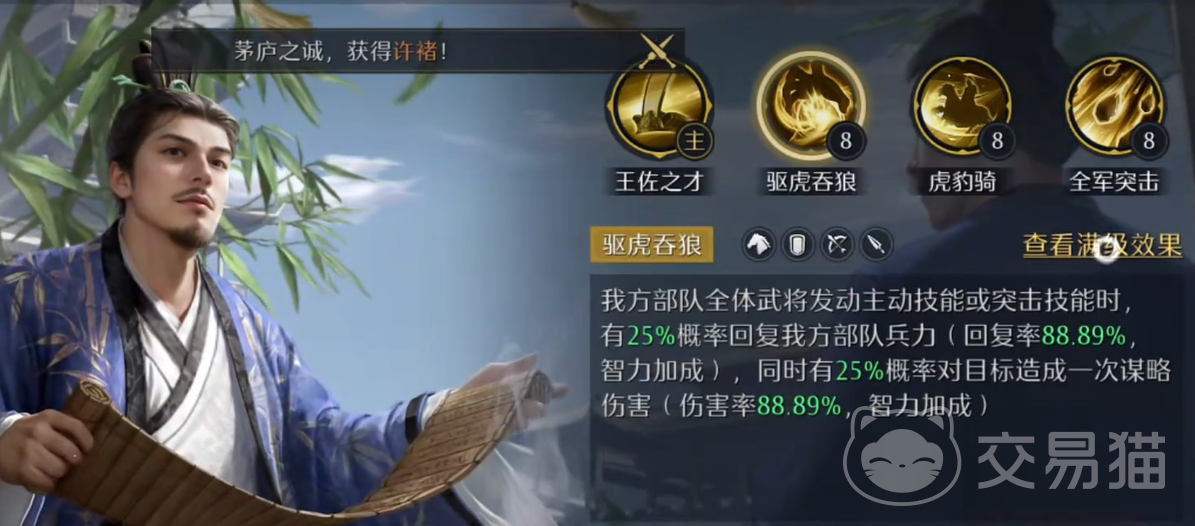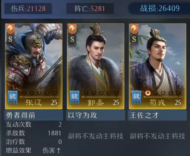 高频连击的持续运转,离不开荀彧的“驱虎吞狼”技能支撑。该主动技在己方全体武将释放主动或突击技能时,均有机会触发:一方面恢复部队兵力,另一方面追加一次谋略伤害。当张辽稳定提供连击增益后,全队技能释放频次显著上升,从而大幅提升“驱虎吞狼”的实际触发次数,形成“连击→触发→回血+伤害→再连击”的正向循环链路。