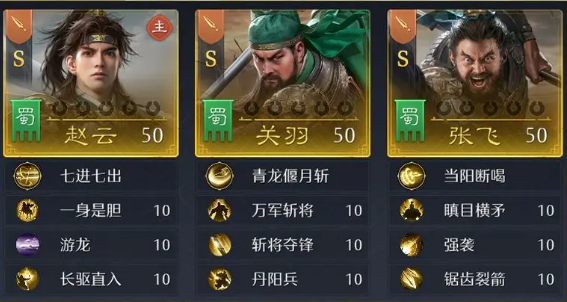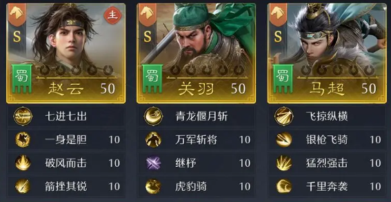 以主动枪体系为例,赵云担任主将,搭配关羽与张飞,三人统一配置枪兵,激活3S枪兵专属加成——全队基础属性提升10%。该组合兼顾爆发与稳定性,适用于多种PVP场景。若资源允许,亦可将张飞替换为马超,三人转为骑兵配置,组成3S骑兵阵容,此时关羽转为功能型辅助,由马超与赵云共同承担核心输出职责,成型门槛较低且对抗表现均衡。
