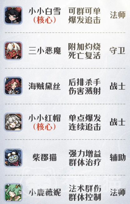 稳定输出与生存能力兼备的初始队伍,是顺利过渡前期的关键。推荐以小小白雪为核心组建六人队:三小恶魔、海贼黛丝、小小红帽、柴郡猫、小鹿薇妮。该组合获取门槛低、培养成本可控,且在1星至15星全阶段均具备实战竞争力。