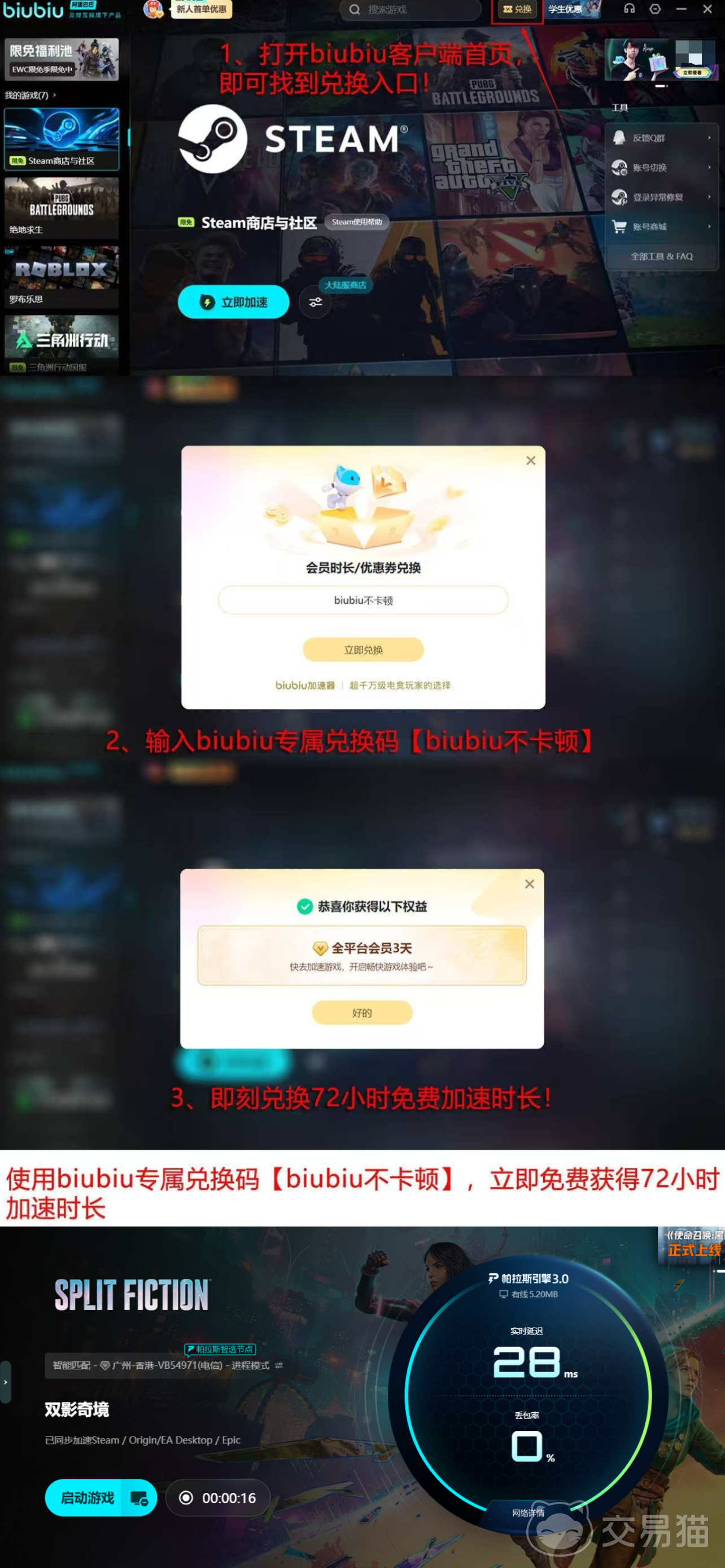 新用户首次注册并登录后,可立即获得24小时全功能加速时长;所有账号还享有通用三日体验权限,用户可在客户端内兑换中心输入口令【biubiu不卡顿】领取使用资格。