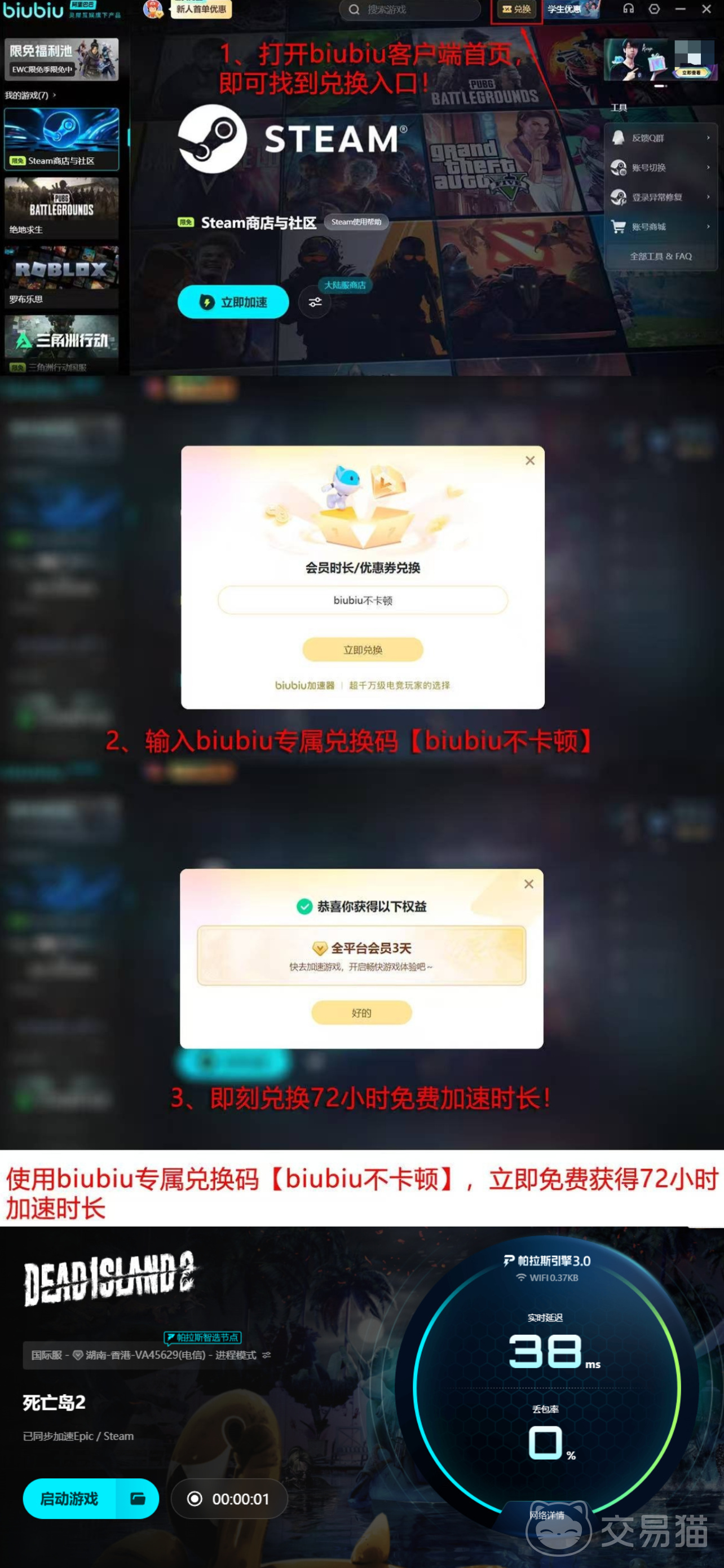 新用户注册后即可获得24小时全场景免费提速服务,覆盖Steam商店浏览、游戏下载及在线游玩等全部环节。此外,平台面向全体用户同步开放为期3天的加速福利,输入口令“biubiu不卡顿”即可领取,无需额外付费或绑定条件。