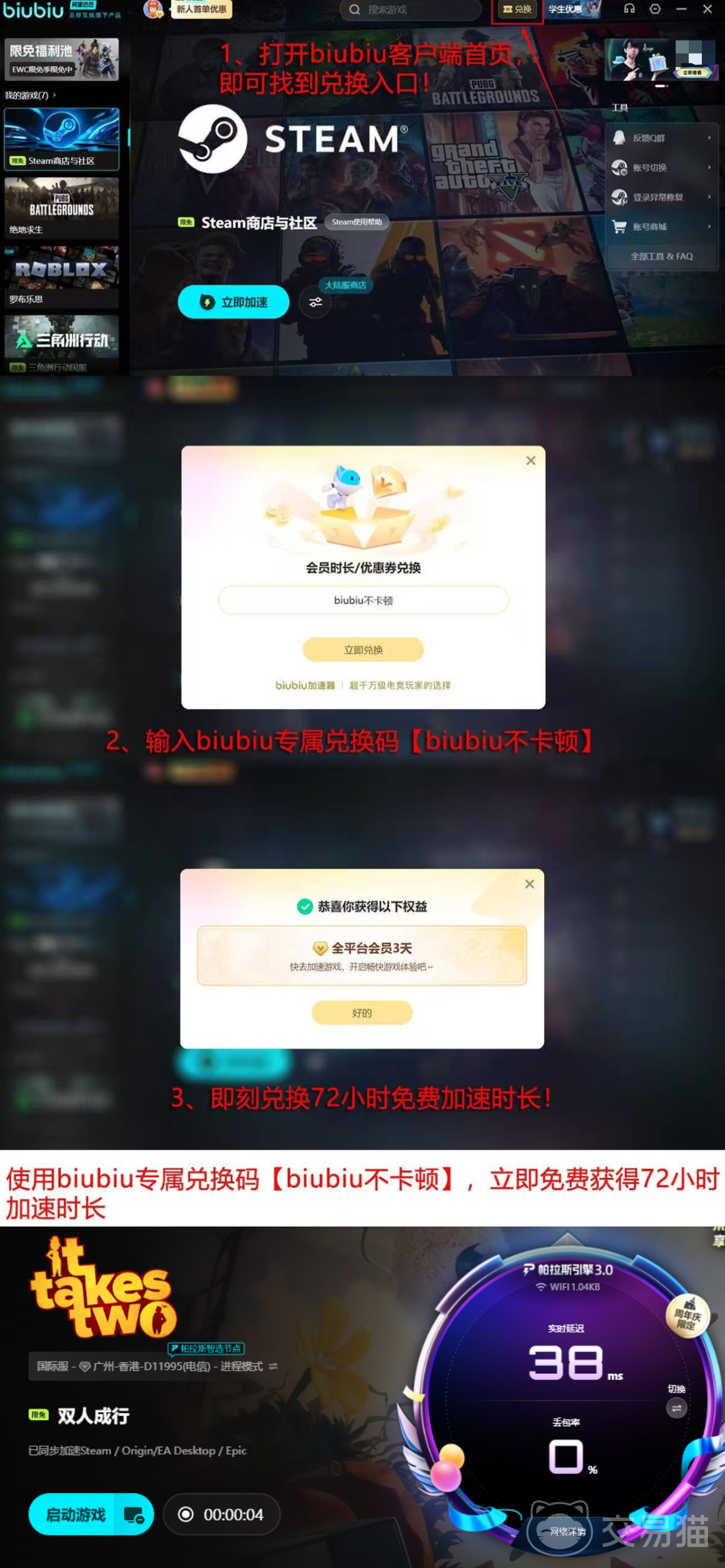 新用户注册后即可获得24小时全功能试用权限;若需进一步体验,平台还面向全体用户提供为期三天的完整服务体验期,领取方式为在指定界面输入口令【biubiu不卡顿】。