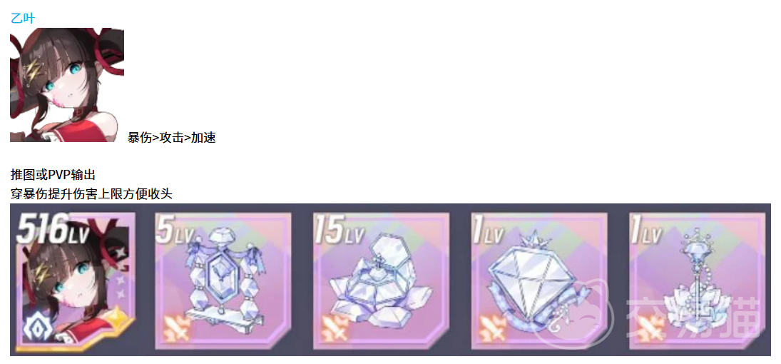 乙叶兼具收割与机动特性,在常规推图及竞技场中均以高爆发见长。“暴击伤害”始终为最优主属性;“攻击力”与“加速”根据副本类型动态分配:面对普通关卡时侧重伤害总量,而恶灵讨伐模式下,“加速”权重显著提升,因其被动斩杀效果的触发频率与出手速度强相关,提速可大幅提高残血目标的终结率。