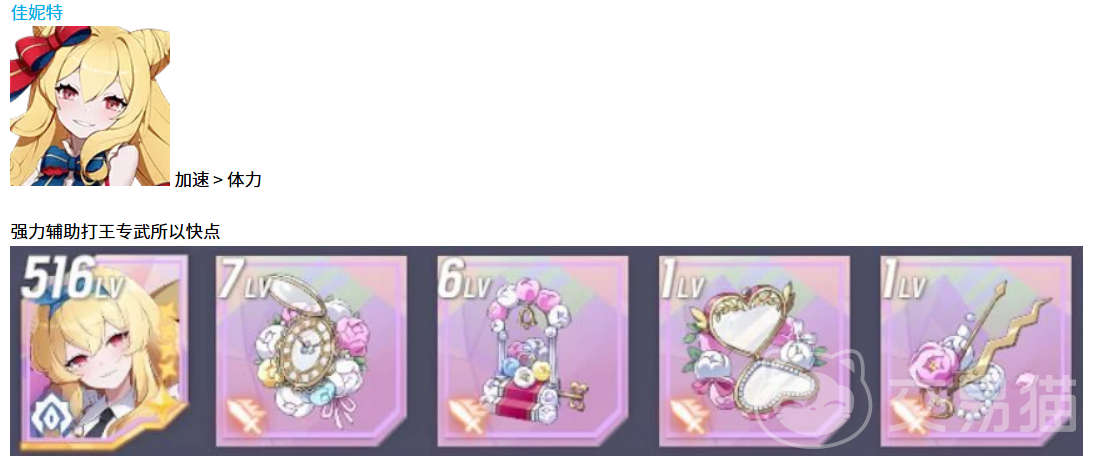 佳妮特作为团队增益型辅助,技能释放时机决定全队输出节奏。“加速”是其装备不可替代的第一属性,直接影响增益覆盖率;“体力”为第二属性,确保其在敌方集火下存活至关键技能释放完毕。专武提供的特效与高速度叠加后,可显著缩短全队技能真空期,优化整体输出环境。