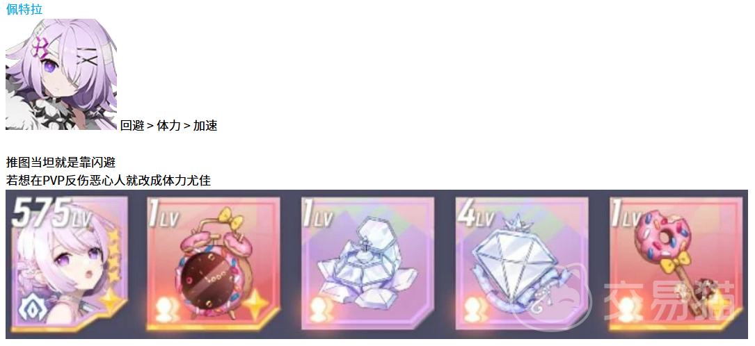 佩特拉的核心价值在于前排承伤与反制干扰。其被动反伤机制与高回避率形成协同效应,故装备首选“回避”主属性;次选“体力”,用于延长站场时间并增强反伤总量;“加速”作为第三优先级属性,可提升技能释放频率,加快护盾覆盖节奏。若用于竞技场压制流阵容,体力权重需进一步上提,以保障反伤持续生效。