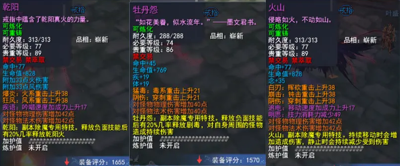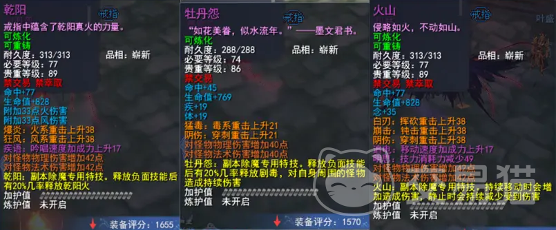 在日常玩法中,黄泉戾影作为高频刷取副本,支持每日挑战,主要产出饷银资源;而试炼迷窟则侧重于特殊装备获取,是获取高阶戒指的关键渠道。可掉落的戒指包括牡丹怨、影龙牙、火山、风林等,每件均附带独特主动或被动技能,在组队下本时具有显著战术价值,属于主流队伍配置中的常备装备。