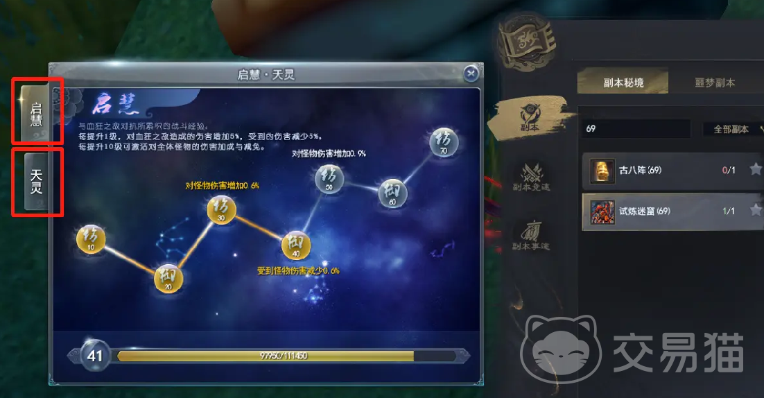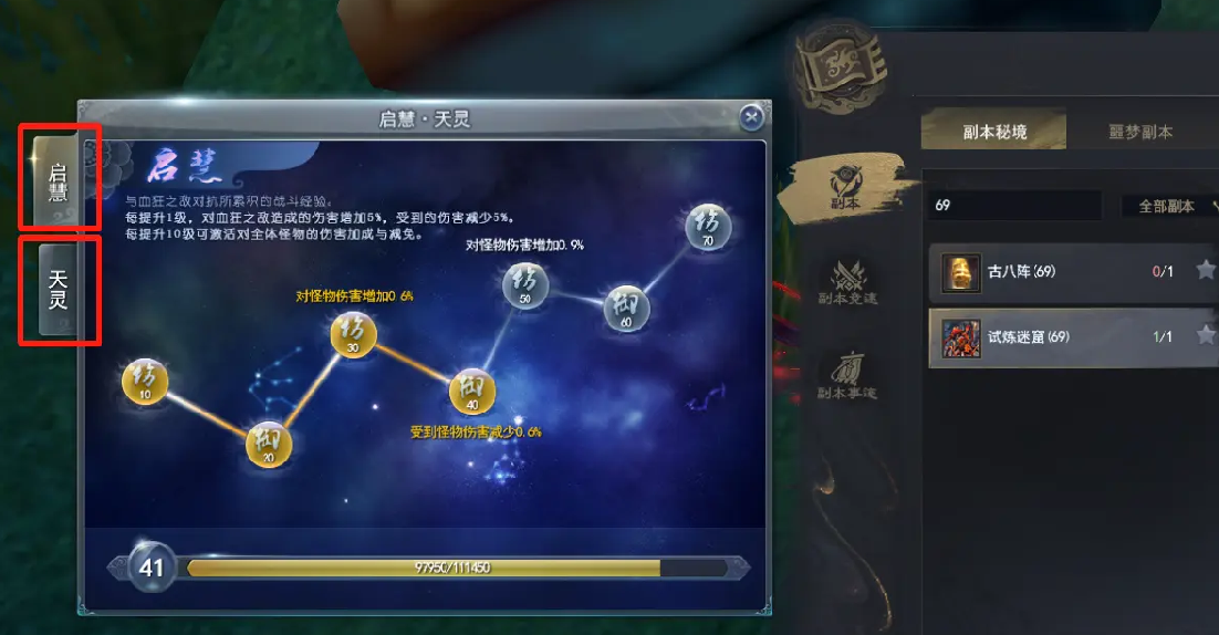 试炼迷窟是《天下万象》中启慧系列的重要副本之一,整体难度适中,但设有明确的准入门槛。玩家需角色等级达到69级方可进入,与同属启慧体系的黄泉戾影副本形成配套机制——后者开放等级为60级,两者共同构成提升启慧等级与天灵点数的核心途径。