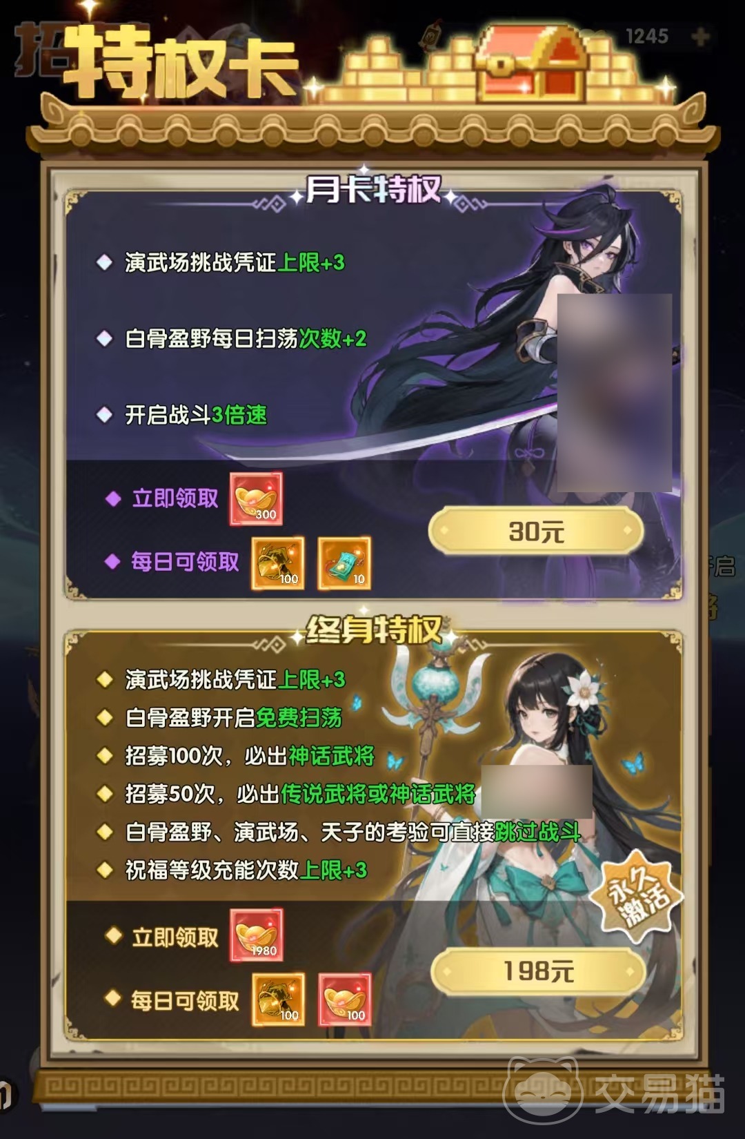 2、月度特权服务——长期性价比之选。提供30元月卡与198元终身特权两种选项,其中月卡涵盖每日体力、金币、招募券等稳定资源补给,且所有加成内容均可通过日常积累逐步达成。考虑到版本更新节奏与养成周期,单月续订更具灵活性与可控性。