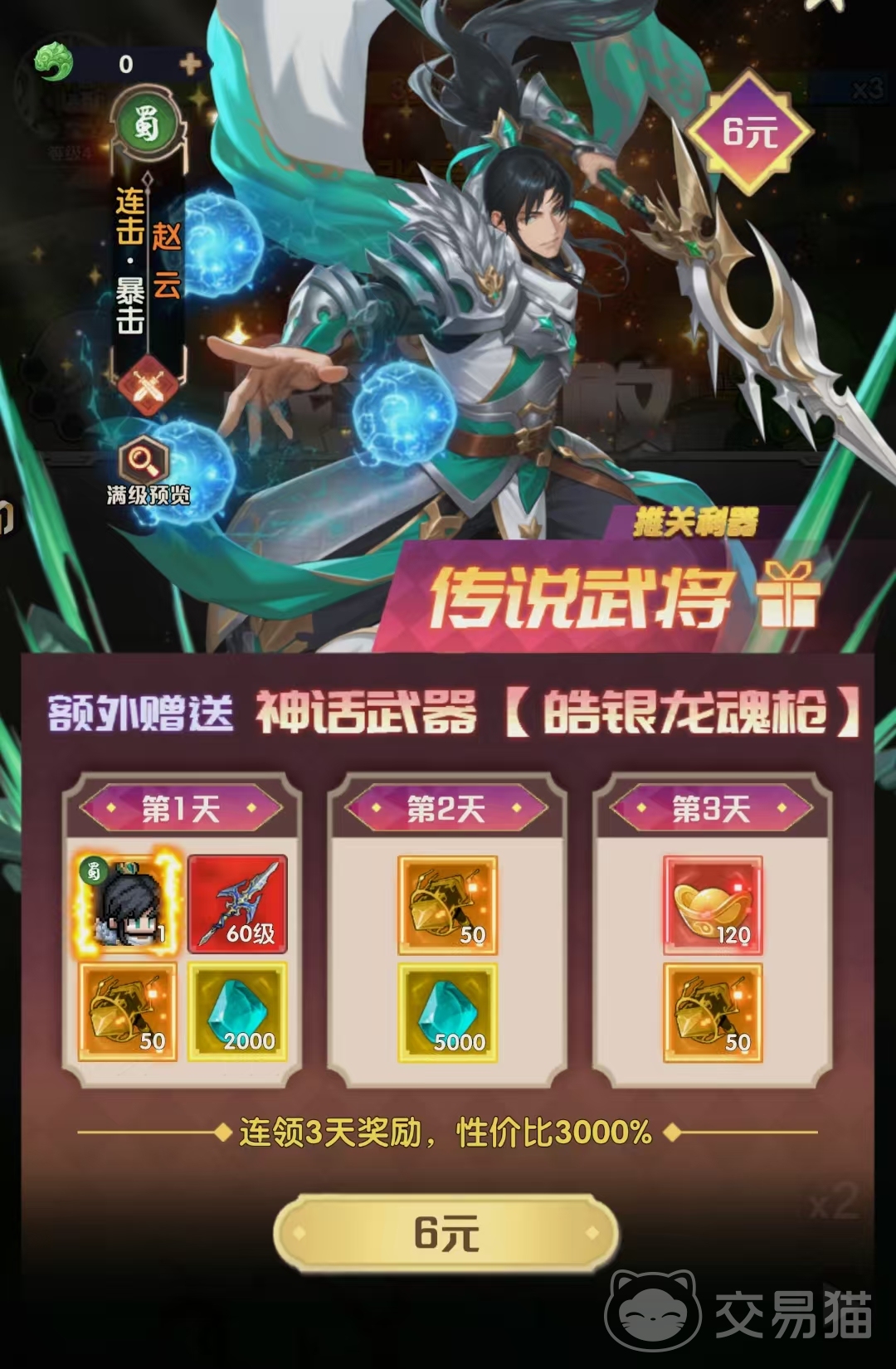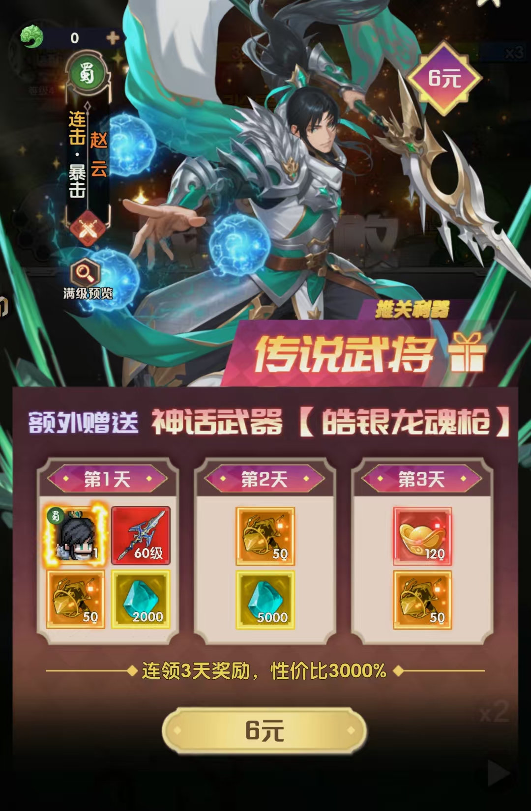 1、首充双倍返利——新手阶段唯一必选项。首次充值任意金额即可领取传说品质输出型武将“赵云”,该角色具备全队适配性,可稳定担任主力C位。配合前期资源集中培养,能显著缩短章节通关周期,提升推图效率。