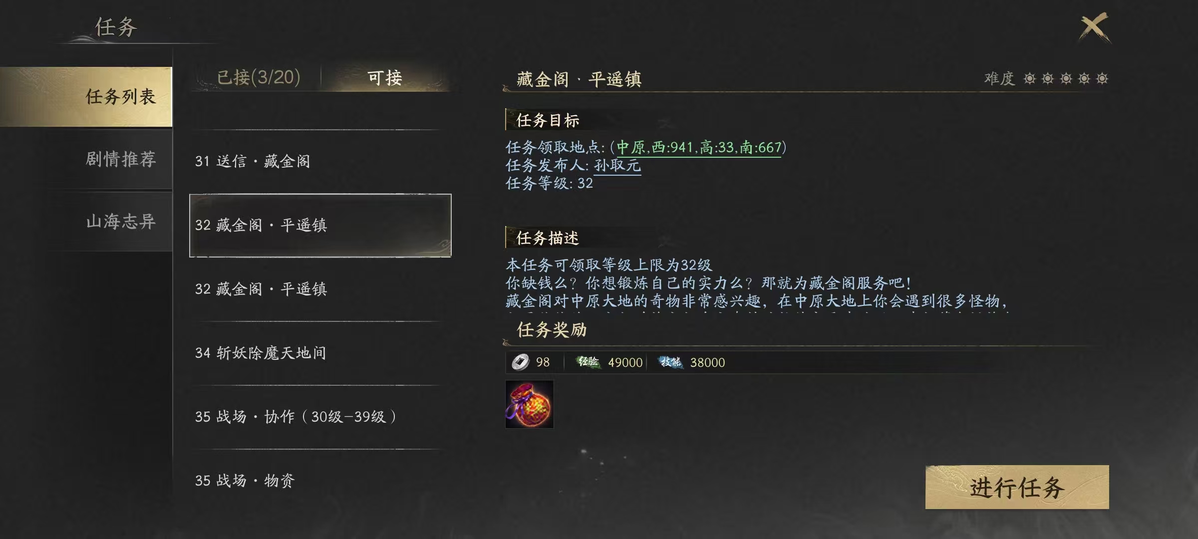 “藏金阁任务”面向30级以上角色开放,每周每类任务限做两次。玩家需根据任务指引前往指定地图区域击杀对应等级怪物,成功后可获得奇石、玄铁等关键材料,并同步获取大量经验、技能点及天宝声望。各任务所对应的区域怪物等级存在差异,建议领取后查阅具体说明再行前往。