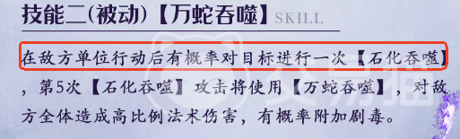 二技能“万蛇吞噬”是节奏转换与清场质变的关键。当敌方单位行动后,有概率触发“石化吞噬”进行追击;累计触发5次后,自动释放一次全体高倍率法术伤害,并额外概率附加中毒。该机制使其在面对高频行动、多动型敌人(如连动Boss或召唤流阵容)时收益极高,越到中后期,触发频率与清场效率越明显提升。