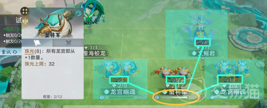 另一条成熟路径是以龙珠为能源中枢的蟹将军增值体系。该路线依托虾铳手、文鳐君、鬼法师在每回合结束时稳定产出龙珠,为蟹将军与龙宫幽魂持续充能;当珠光效果被激活后,全体龙宫部从将获得统一的数量暴增加成,进一步放大整体作战密度与压制能力。