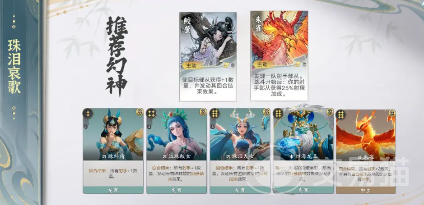 “珠泪哀歌”是龙宫爆兵流中实操门槛最低、反馈最为迅捷的子体系。该组合由珠泪天女、泣珠鲛女、珠蚌精构成三角联动闭环:每回合结束时三者相互触发增益,定向强化射手类部从的数量上限;再经朱雀提供额外增幅加成,并由四海龙王二次激活全部回合结束效果,最终推动射手单位在单回合内达成指数级数量爆发。