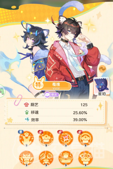 莓瑰为双人组合角色,由蓝莓猫形态的姐姐与草莓猫妖形态的弟弟构成。二者协同触发“共感料理”机制:在制餐阶段,全体店员(含自身)厨艺值获得基础提升;当队伍中存在其他悠云系角色时,该增幅效果进一步强化,形成明显的协同优势。